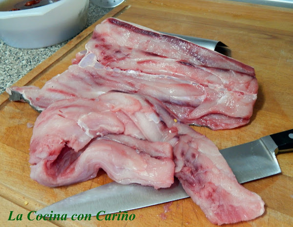 Sacamos la piel y limpiamos de las espinas, que luego utilizaremos para hacer el caldo de pescado.