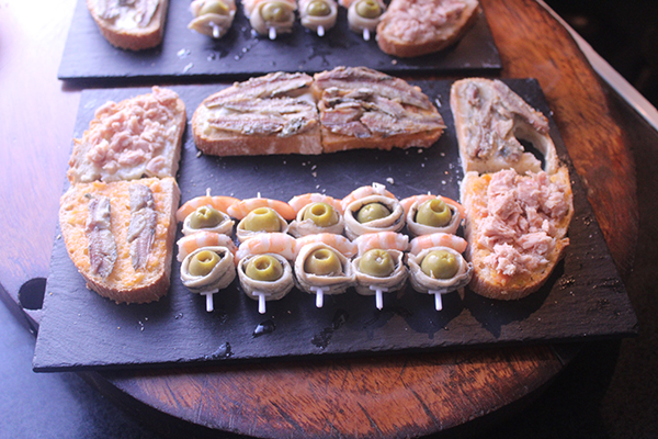 Envolvemos una aceituna con un filete de boquerón en vinagre, lo aguantamos con la ayuda de un palillo, insertamos media gamba, otra aceituna envuelta con un lomo de boquerón y terminamos con la otra mitad de gamba.