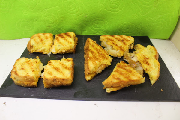 Cortar a cuadraditos el biquini de queso y a triángulos el de pollo, para facilitar el trabajo a nuestros comensales.