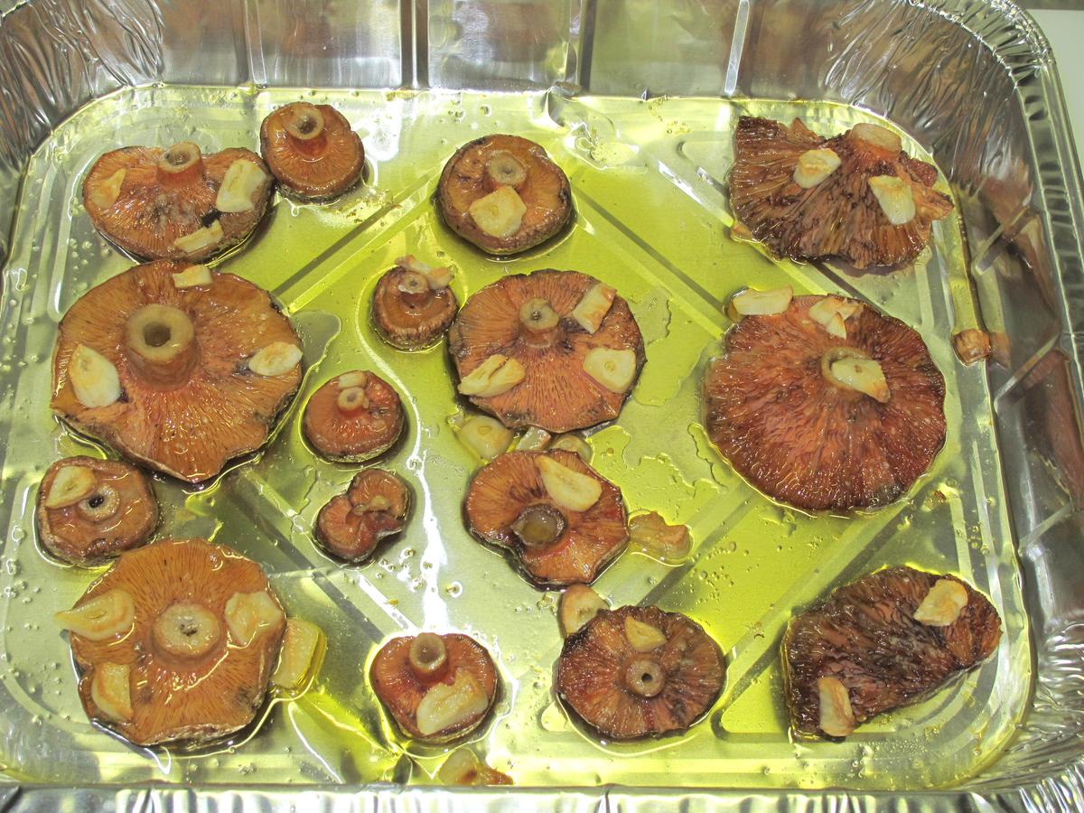 Una vez limpios los rebollones, se ponen en una bandeja de hornear con ajos laminados, aceite y sal Elaboración: