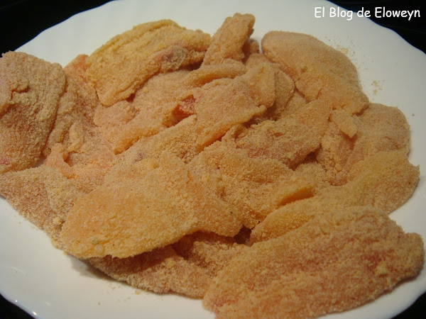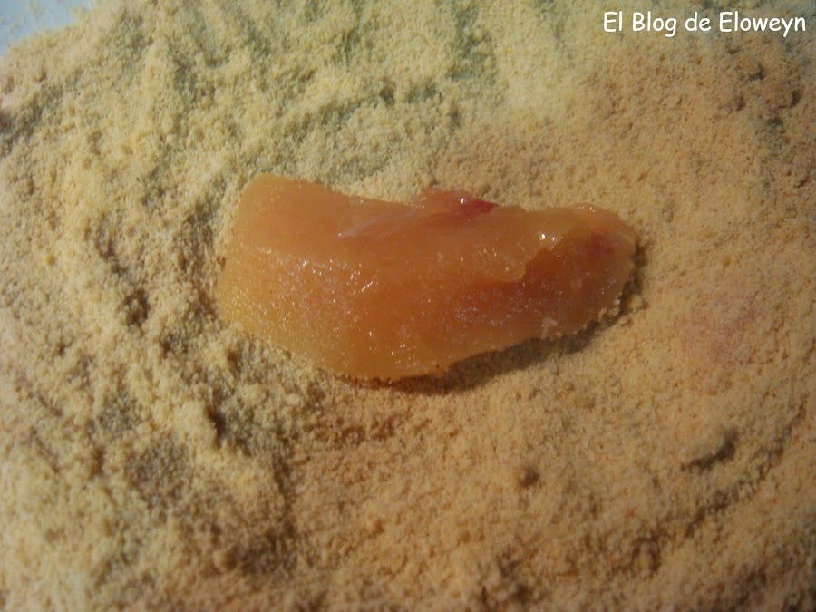 Pasar el pollo por la mezcla, apretando bien para que se quede adherida al pollo. Primero por un lado...