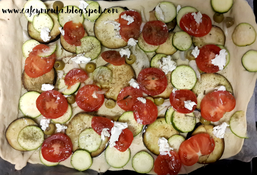 5. Cuando la coca lleve 5 minutos en el horno, la sacamos y le colocamos las verduras, que tiene que estar cortadas a rodajas y las hierbas provenzales. Le añadimos también un chorro de aceite, y horneamos durante 15 minutos hasta que la masa esté dorada y las verduras tiernas.