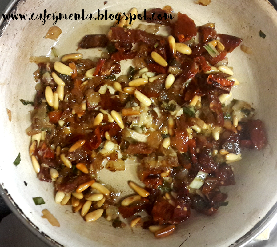 4. En una sartén doramos el ajo y le añadimos todos los ingredientes que habíamos reservado menos el queso y dejamos que se integren.