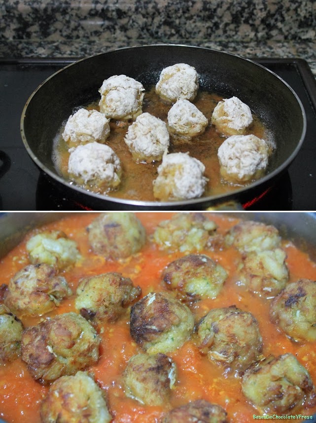Las pasamos por harina y en una sartén con abundante aceite las ponemos a freir. Una vez estén las incorporamos a la sartén del la salsa de tomate y dejamos hacer 5 minutos más. Y Listo!!!