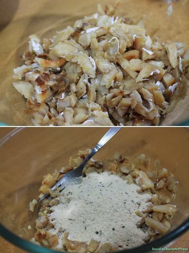 Moreover, once well desalted cod, with corresponding changes of water, I began to crumble into small pieces. We take bread crumbs and minced garlic and mix well to proceed to make pellets.