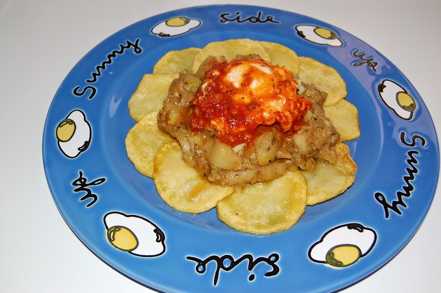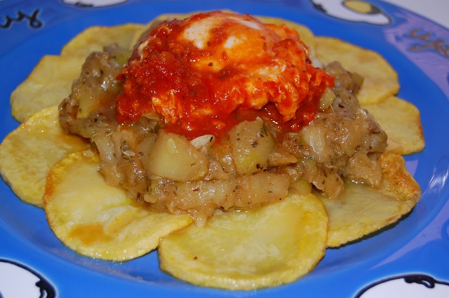 - Poner una base con las patatas y montar el plato por capas: Patatas, calabacines con el pollo rehogado, tomate frito y huevo.
