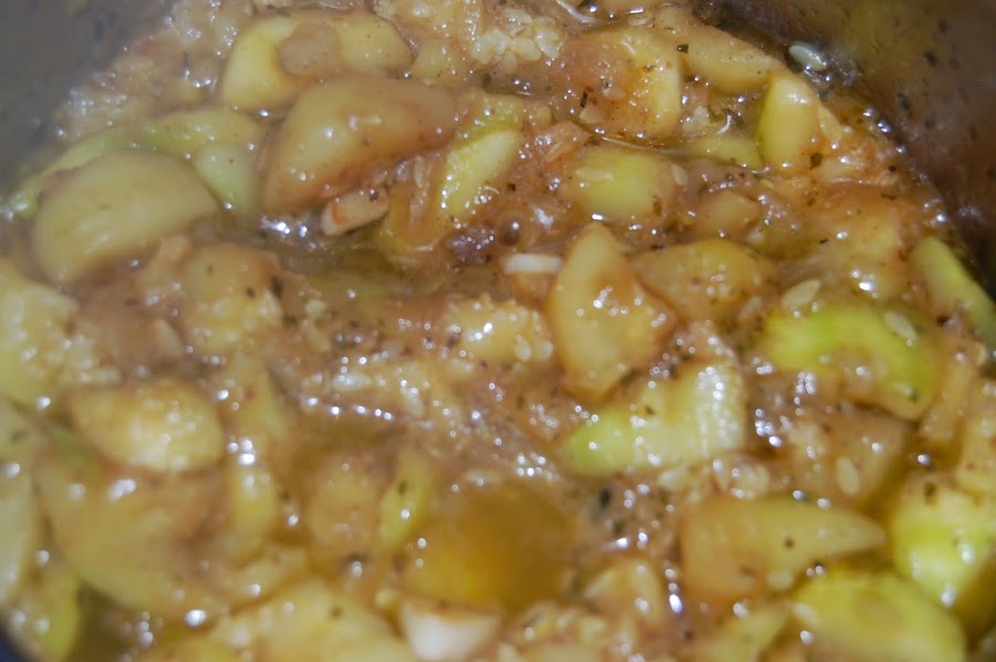 - Cortamos los calabacines muy finos con el pelador y rehogamos con un poco de aceite de oliva y un poco de puerro y cebolla.