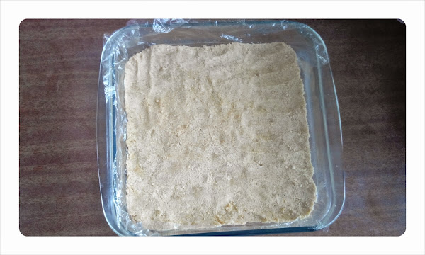 Preparamos un cuadrado y lo emplasticamos para desmoldarlo fácilmente. Vertimos en el las galletas trituradas con la mantequilla y lo aplanamos de manera uniforme. Lo refrigeramos mientras preparamos el resto.