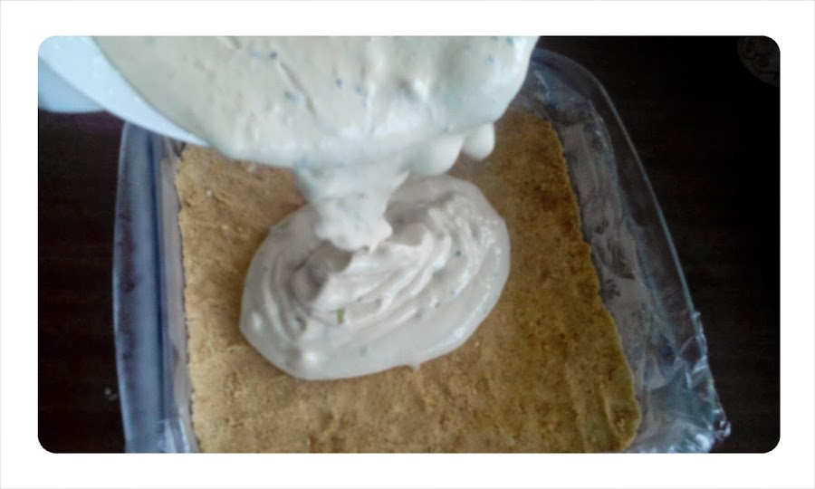 Cuando ya todo este bien integrado, cremoso y sin grumos lo vertimos sobre la base de galletas y lo aplanamos para que quede la superficie lisa.