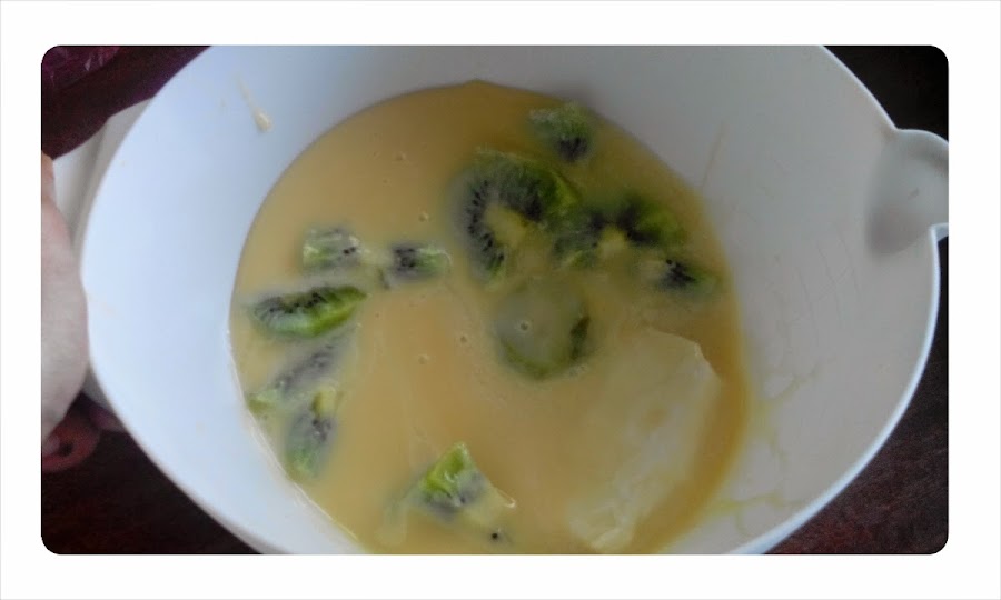 Luego batimos el queso crema junto con la leche condensada, dos kiwis partidos en trocitos y el zumo de limón.