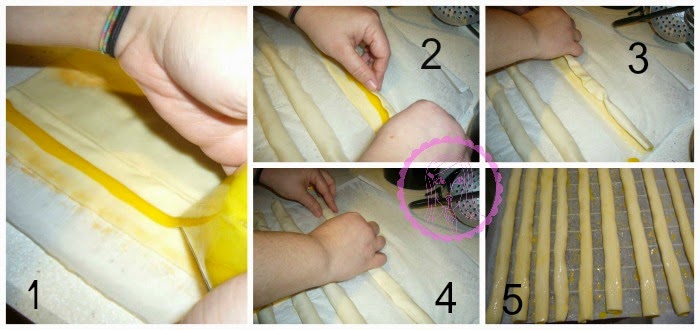 Estira las placas de hojaldre sobre el papel que traen; córtalas en tiras de unos 4 ó 5 cm y pon un poco de huevo batido en los bordes de cada corte (solo por un lado) para después poder cerrar bien la masa y que no se abra al cocer (reserva el huevo que te sobre).