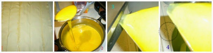 Con la manga (ya sea la pastelera o la improvisada :o) ponemos en el centro de cada tira una línea de yema (no muy gruesa), repetimos la operación en cada una las tiras .