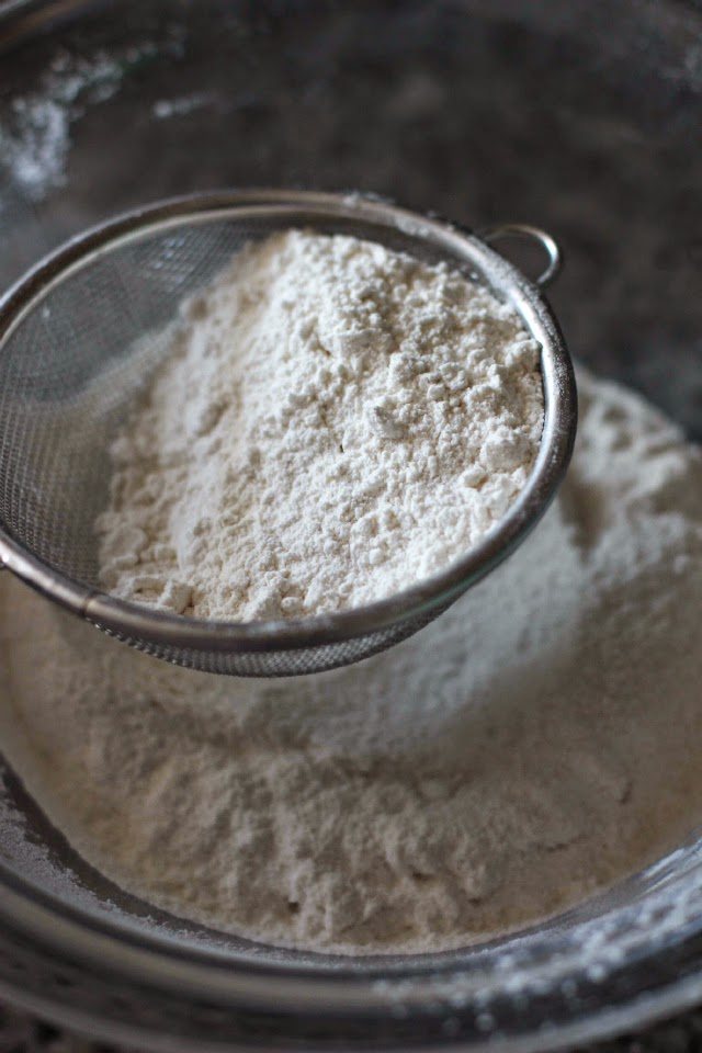 En un bowl o recipiente aparte cernir 2 tazas de harina (pasar por un colador) y agregar 2 cucharaditas de polvos de hornear y una cucharadita de sal y mezclar. Luego agregar los huevos y el extracto de vainilla y revolver.