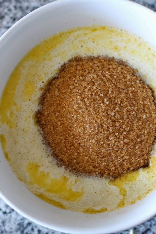 Derretir los 180 grs de mantequilla en una olla o microondas e incorporar la azúcar morena, mezclar ambos ingredientes muy bien y dejar entibiar durante algunos minutos.