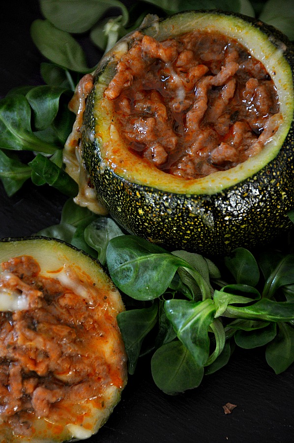 - Quitar el papel de aluminio a los calabacines. Rellenarlos con la carne picada ya cocinada, póngale una lonchita de queso, la tapita y vuélvalos a poner en el horno 5 minutos a gratinar. 200 ºC calor arriba con ventilador.
