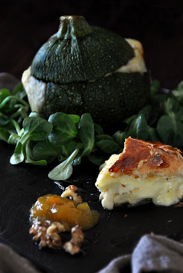 - Ponga los calabacines sobre una capa de canónigos, acompáñelos con una cuña de queso en hojaldre y confitura de melocotón, nueces o almendras.