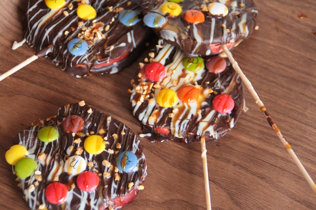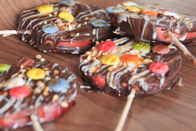TERCER PASO: Mientras el chocolate se funde, introducimos los palos dentro de las rodajas de manzana. Puede que necesitéis hacer una pequeña incisión con el cuchillo.