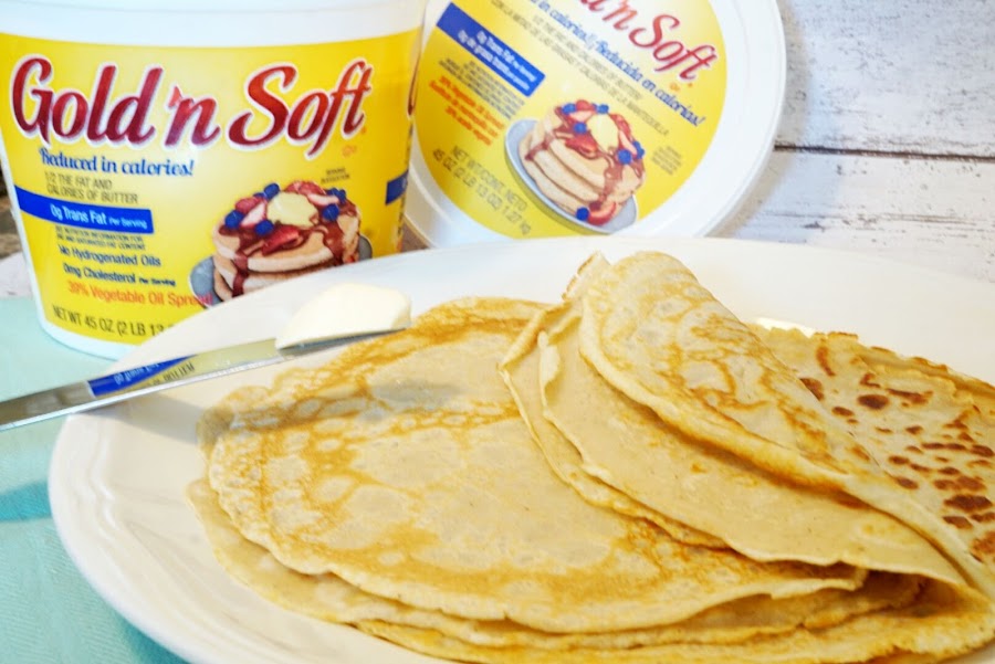El secreto para que queden esponjosas y suaves es que le agregues un poco de mantequilla derretida, y que poco a poco vayas agregando la harina. A mí en lo personal me gusta utilizar Gold n Soft butter porque tiene un delicioso sabor a mantequilla, no tiene colesterol ni aceites hidrogenados, contiene zero grasas trans por porción y es fácil de extender sobre las crepas ya terminadas.