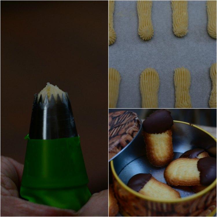 Introduce en una manga pastelera con boquilla rizada y forma las galletas sobre una bandeja de horno forrada con papel de horno.