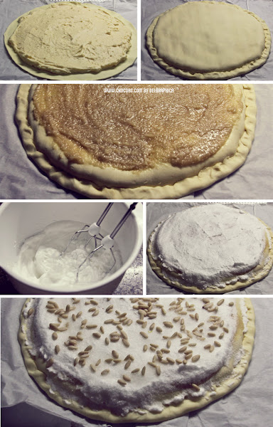 Con el resto de claras, las montamos a punto de nieve y las repartimos por encima de la crema de almendras. Espolvoreamos con azúcar (sed generosas) y los piñones.