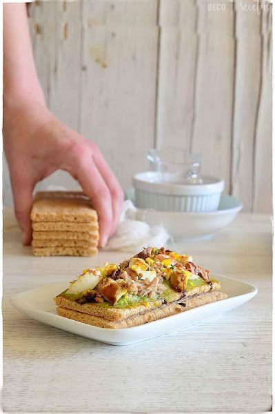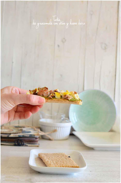 1.- Unta el guacamole en la rebanada de pan, y por encima añade el atún y el huevo duro.