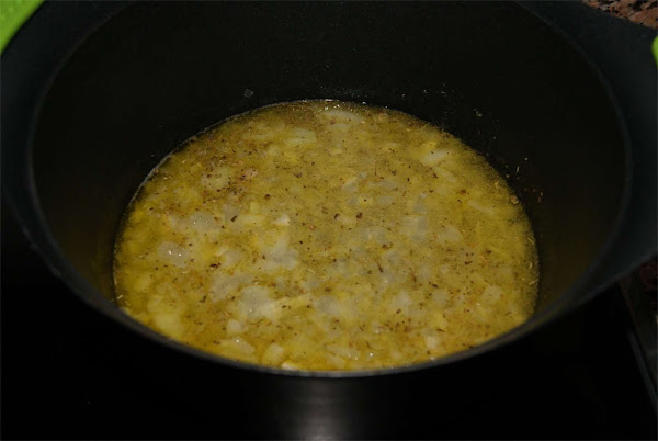Cuando esté dorada la cebolla, incorporamos el vino y subimos el fuego para que se evapore el alcohol. Cuando esté listo añadimos el agua. las hierbas provenzales y el colorante y dejamos que cueza.