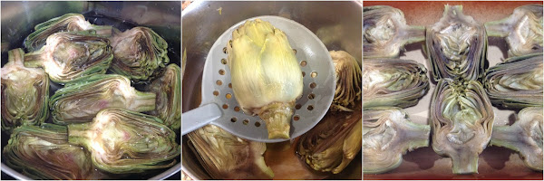 Lavamos y quitamos las hojas más duras de las alcachofas. Las cortamos por la mitad a lo largo y las ponemos a hervir en abundante agua con sal, durante 20 minutos. Las retiramos del fuego, les escurrimos el agua de cocción y las ponemos dentro de una fuente para horno.