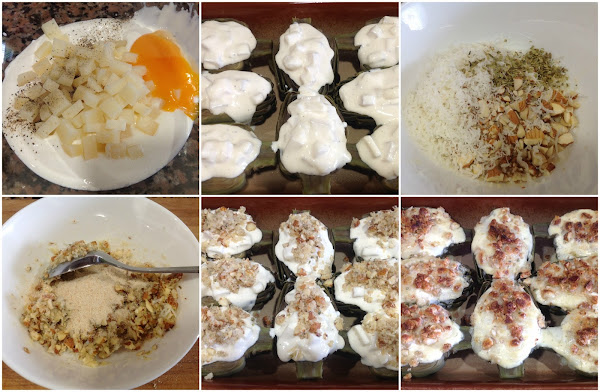 En un bol mezclamos la nata (crema de leche) con la yema de huevo, sal, pimienta y 150 gr de queso troceado. Rellenamos las mitades de alcachofas.