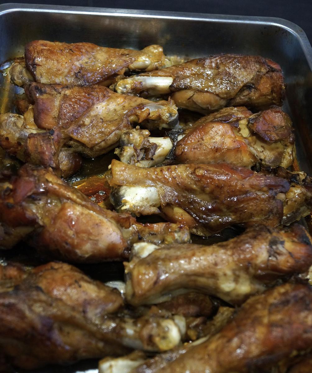 Añadimos unas gotas de aceite de oliva por encima de los “muslitos” de pavo, y podemos salpimentarlos muy ligeramente, sólo queremos que la piel esté más buena, la carne ya tiene la cantidad de sal adecuada del marinado.