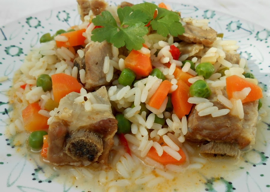 Troceamos los pimientos, pelamos y troceamos la cebolla y la zanahoria, colocamos el aceite en una sartén y la calentamos a fuego medio. Bajamos el fuego y agregamos las verduras cocinando durante 5 minutos, cuidando que no se quemen. Añadimos las costillitas e incorporamos el arroz. Cubrimos con el caldo y cuando comience a hervir agregams los guisantes congelados y dejamos que se cocinar durante 12 minutos (depende del arroz que elijamos. Siempre recomiendo que se respete el tiempo de cocción que pone en el envase del arroz).