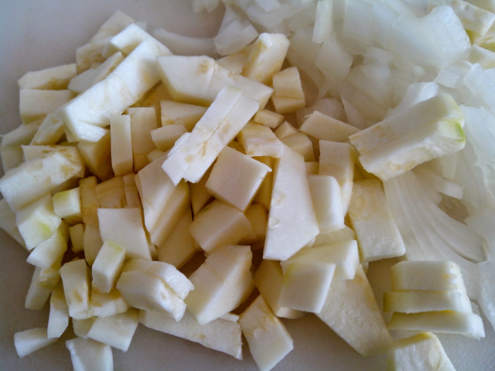 Cocemos el arroz y la merluza. Mientras tanto picamos media cebolla y medio calabacín.
