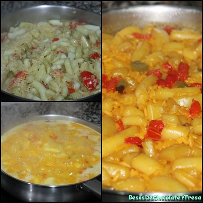 Cuando esté hecho, añadir las anillas de calamar cortadas en daditos y dejar hacer todo junto un par de minutos y cuando esté pasado añadir el arroz y las tazas de agua.