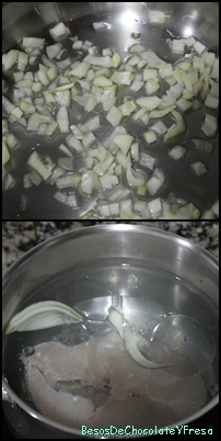 Poner en una sarten, aceite y pochar la cebolla y en otra olla poner agua con un chorrito de aceite y cebolla y dejar hervir para cocer el pescado.