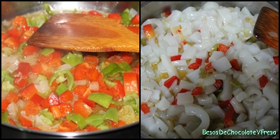 Cuando esté dorada la cebolla, echar los pimientos bien picados y dejarlo hacer. A continuación el 1/2 vaso de vino blanco para que coja sabor.