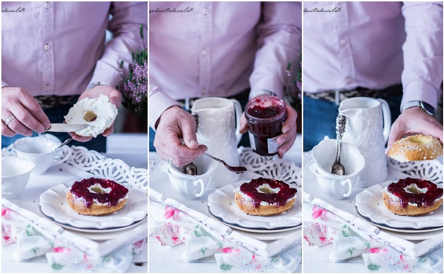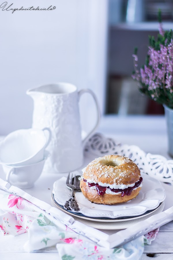 Ya solo tenemos que abrirlos y rellenarlos con lo que más nos guste desayunar, yo en este caso queso crema y mermelada de frambuesa.