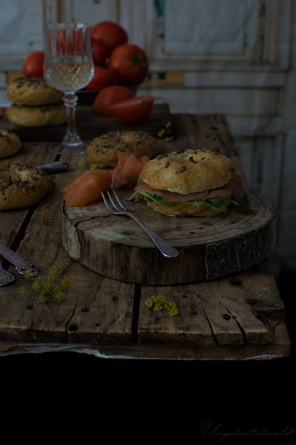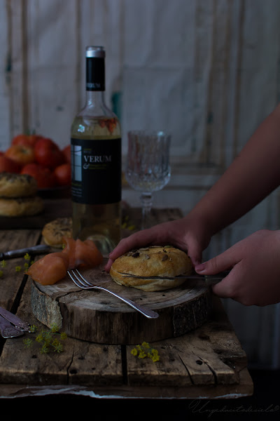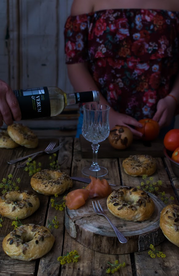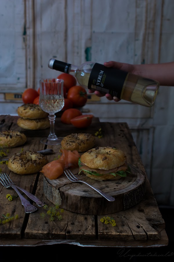 Me decidí por unos Bagels porque me encantan y nunca encontraba la ocasión para hacerlos entre tanta receta dulce, y porque además me venía de perlas para maridarlos con una botella de vino blanco de mis paisanos Bodegas Verum.