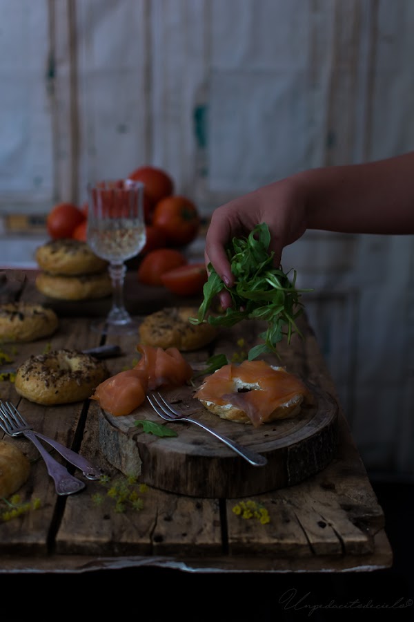 Teniais que haber visto la cara de felicidad de mi familia con los Bagel, recién hechos rellenos de queso crema, rúcula, salmon, flores de hinojo, tomate y cebolla tierna.