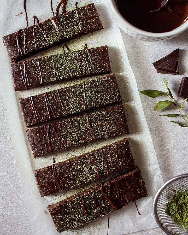 Corta las barritas del tamaño que prefieras, y les vamos a poner un poco de chocolate negro derretido por encima. Para terminar espolvoreamos por encima un poco de té matcha. Ya están listas para tomar como snack o para reponer fuerzas después de hacer ejercicio.