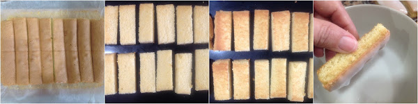 Retiramos el bizcocho del molde y cortamos en tiras, como en la foto. Ponemos las tiras de bizcocho en una bandeja para horno y tostamos 2 minutos de cada lado. Retiramos del horno y dejamos enfriar.