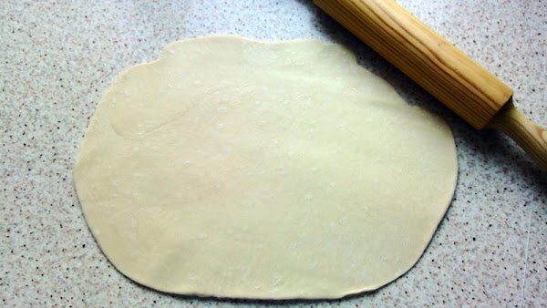 Estirar en la encimera (mesada) ayudándote de un rodillo o palote de madera. Si no tienes puedes usar una botella lisa y limpia. Dejar la masa de medio centímetro de altura aproximadamente (5 mm).