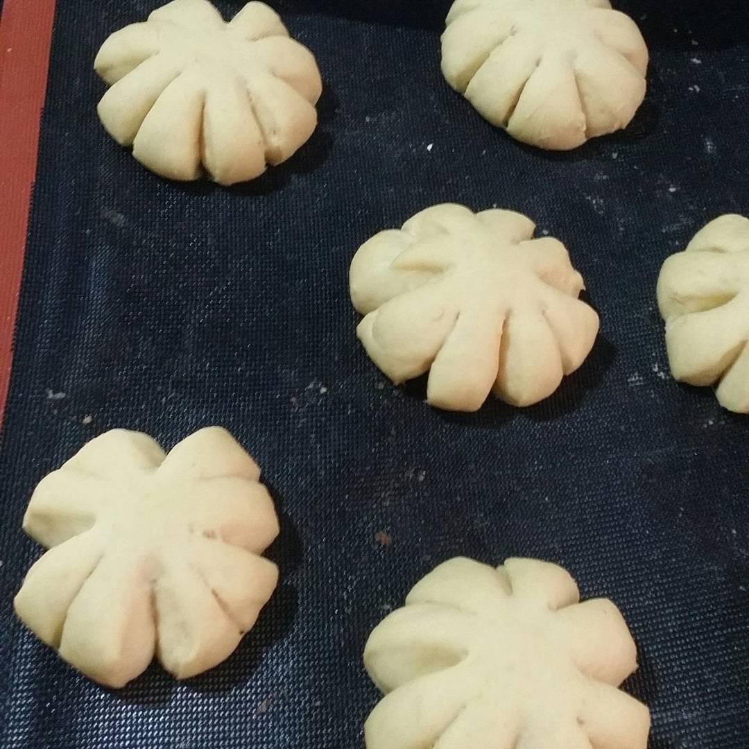 Vuelca la masa en la encimera enharinada y divídela en 15 trozos iguales. Haz bolas. Ponlas en una bandeja de horno y haz 8 cortes en cada bola teniendo cuidado de de no llegar hasta el centro, para hacer la forma de la calabaza.