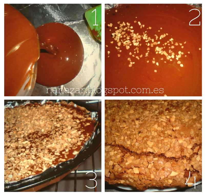Y ya está la mezcla hecha, sólo nos falta verterla en un recipiente, que previamente hayamos cubierto con un papel de aluminio o vegetal para que no se pegue y si deseamos, (1) echarle almendras picadas para que después la superficie quede aún más crujiente. (2)