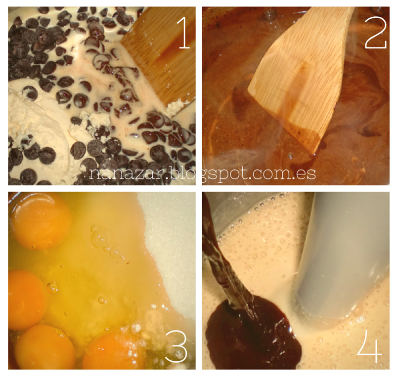 Mientras se funde eso a fuego lento lo vamos moviendo de vez en cuando (2) y mientras tanto podemos ir echando en otro recipiente más grande, para poder batirlo después, 80 gramos de harina, 200 gramos de azúcar y 4 huevos. (3)