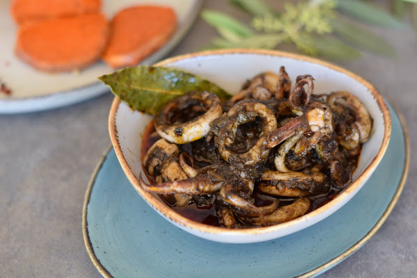 1. Limpiamos el calamar sin quitarle la piel, cortamos en rodajas y reservamos la tinta.