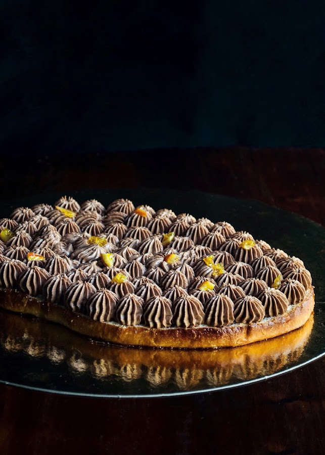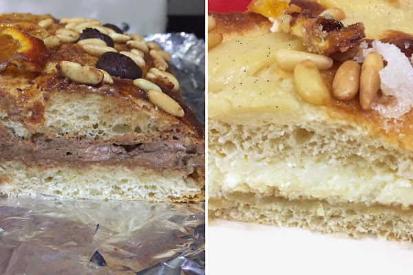 Os traigo dos versiones distitnas de la coca: mi favorita, de trufa, naranja confitada y cointreau, y otra más tradicional, rellena de nata (crema de leche) y yema tostada y cubierta de crema pastelera.