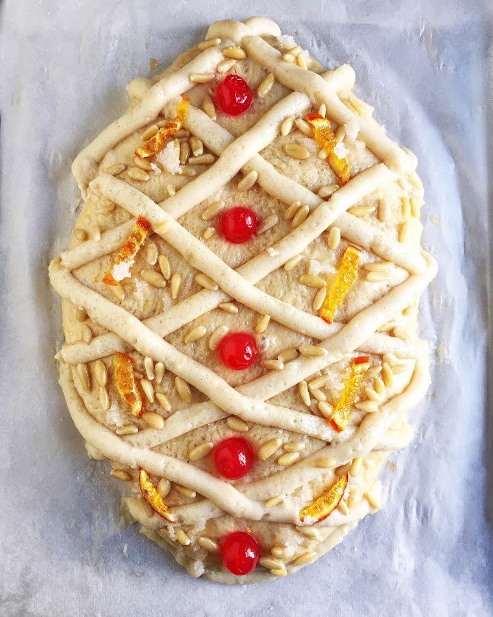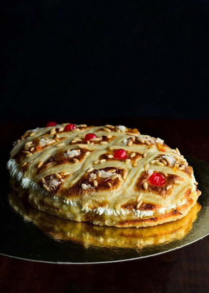 Justo antes de meter al horno, pintar con el huevo, disponer la crema pastelera en forma de rejilla y en los huecos colocar guindas, azúcar y piñones.