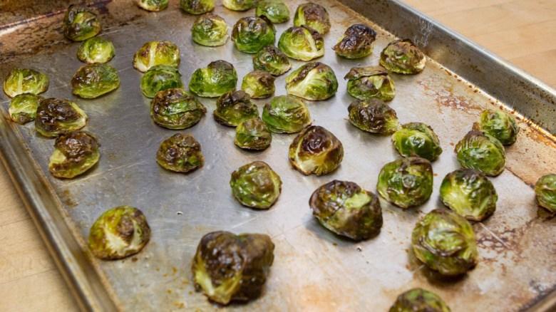 Ponga las coles de bruselas en una bandeja para hornear y agrégueles aceite de canola. Debes cortar una sola capa en la parte de abajo para que tengan equilibrio. Llévalas al horno y asar hasta que estén tiernos durante por lo menos 25 minutos. Puedes pinchar con un tenedor para comprobar su textura.