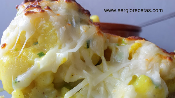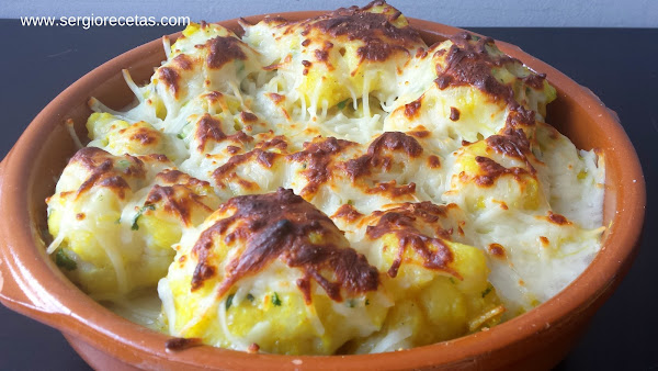Ponemos la mezcla de coliflor y patata en una fuente para el horno, napamos con la veloutte y cubrimos bien toda la superficie con el queso. Metemos a gratinar al horno durante unos 12 minutos aproximadamente.