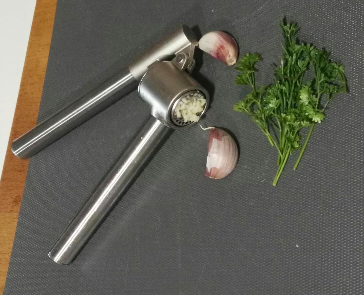 No hace falta ni pelar el diente de ajo, lo metes, apretas fuerte y te sale a presión el ajo machacadito y listo para ser cocinado, desprendiendo todo su sabor sin que se pueda encontrar ningún tropezón desagradable. Yo lo descubrí viendo videos de cocina de Jamie Oliver y desde entonces lo uso muchísimo.