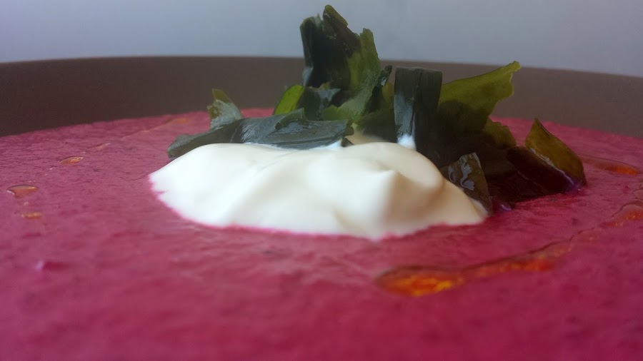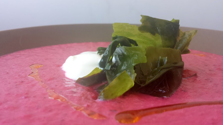 Para presentar ponemos en un plato hondo un poco de la crema de remolacha, sobre estas en el medio un poco del alga wakame y añadimos una cucharadita de yogurt al lado del wakame, unas gotitas de aceite de oliva y a comer y disfrutar en menos de lo que canta un gallo